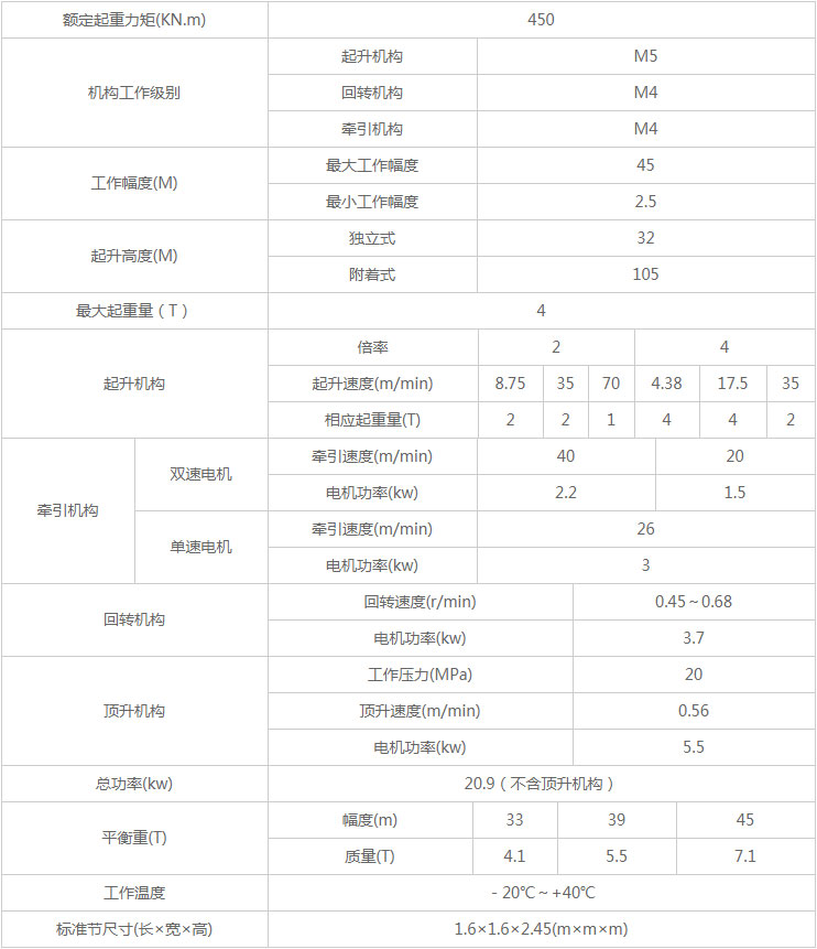 塔机的性能参数及技术经济指标国内一流:最大起重量4.0T,端部最大起重量1.0T,最大工作幅度45M,独立式起升高度为32M,附着式起升高度105M。